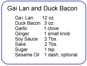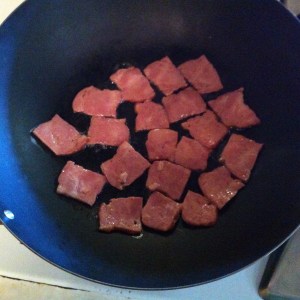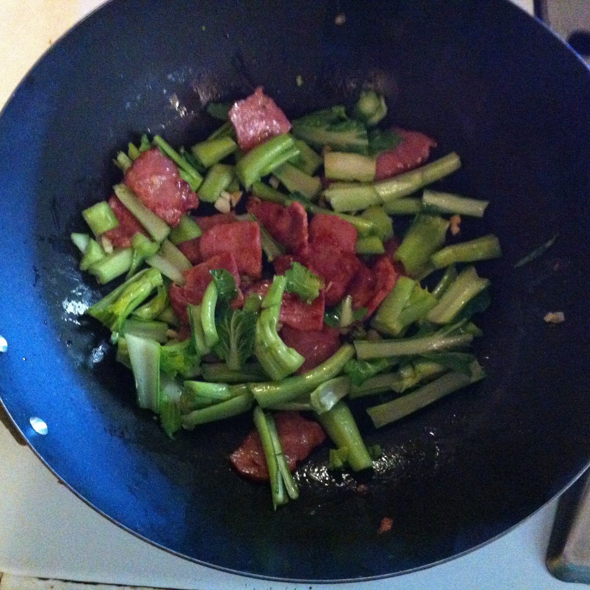 Cut the bacon slices into 1-in. pieces (most easily done if it’s frozen a bit). Fry these slowly, turning them once, in the wok until they begin to render their fat. (Add only a dash of sesame oil if needed; the duck fat alone worked fine for me).