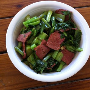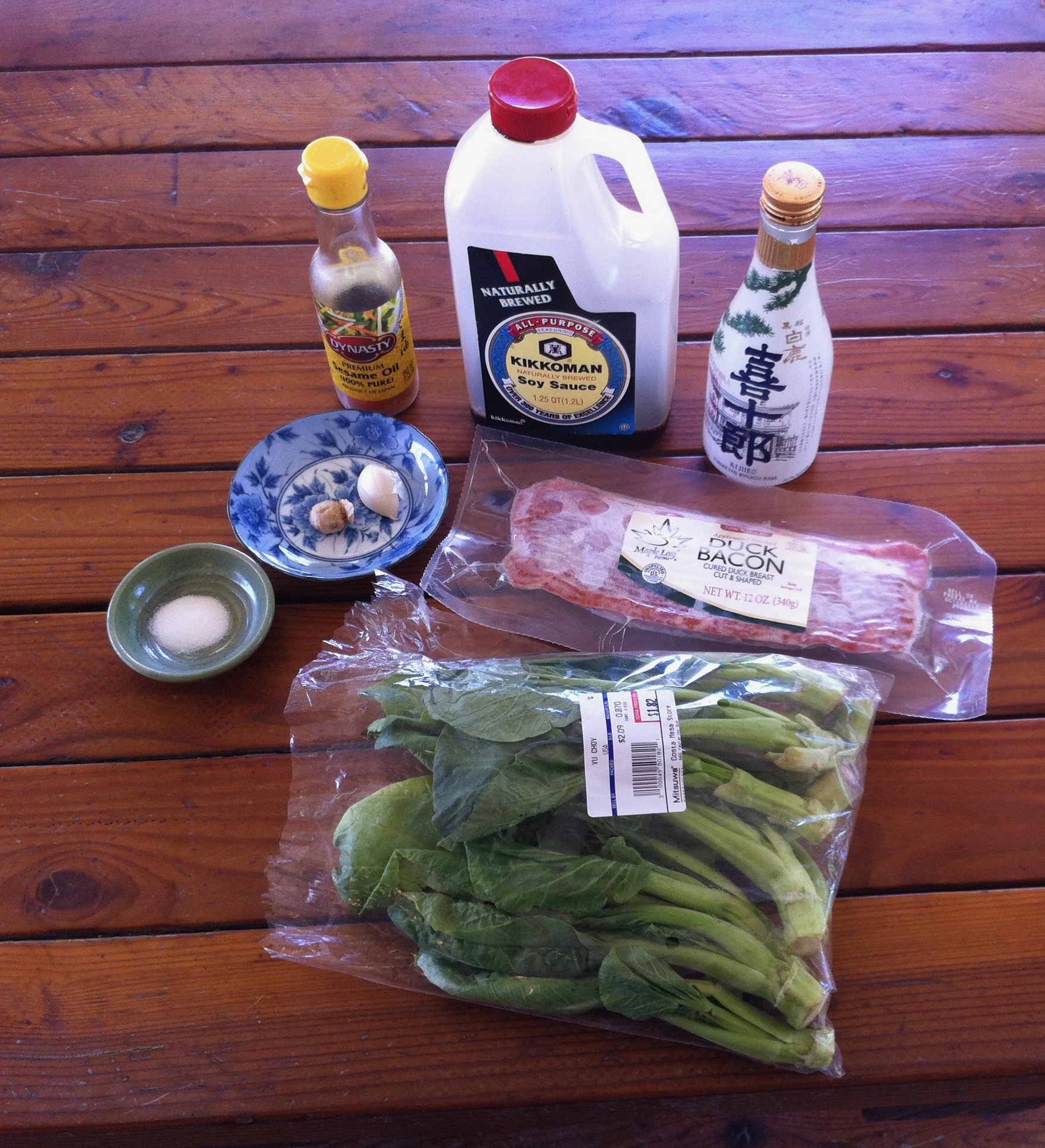 I delight in cruising Mitsuwa’s aisles. This time around, my attention was caught by its produce department’s Chinese broccoli and its meat aisle’s Maple Leaf Duck Bacon. I grant that neither of these is Japanese, but it struck me that each had culinary promise. Indeed, it turns out that they’re a combination not unfamiliar to several cuisines.