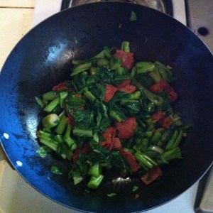 Add the gai lan stalks and stir-fry until they turn bright green, perhaps 1 1/2 minutes. Add the leaves and buds. Stir-fry until they cook down and start to turn limp, maybe another minute.