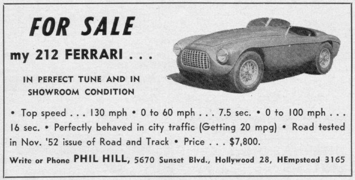 Ferrari and Phil Hill were familiar to R&T readers. Phil was selling this 1951 212 Barchetta with particularly impressive documentation: It had been tested in the November 1952 R&T, got from 0 to 60 mph in 7.5 seconds, and yet was “perfectly behaved in city traffic.”