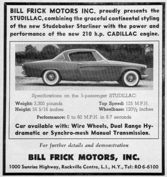 The Studillac was Long Island auto dealer Bill Frick’s idea of combining high style with high performance. Designer Raymond Loewy’s Studebaker Starliner was stunning. A Cadillac V-8 of the mid-1950s could produce 210 hp (compared with a 1954 Studebaker inline-six’s 85 hp or V-8’s 127).