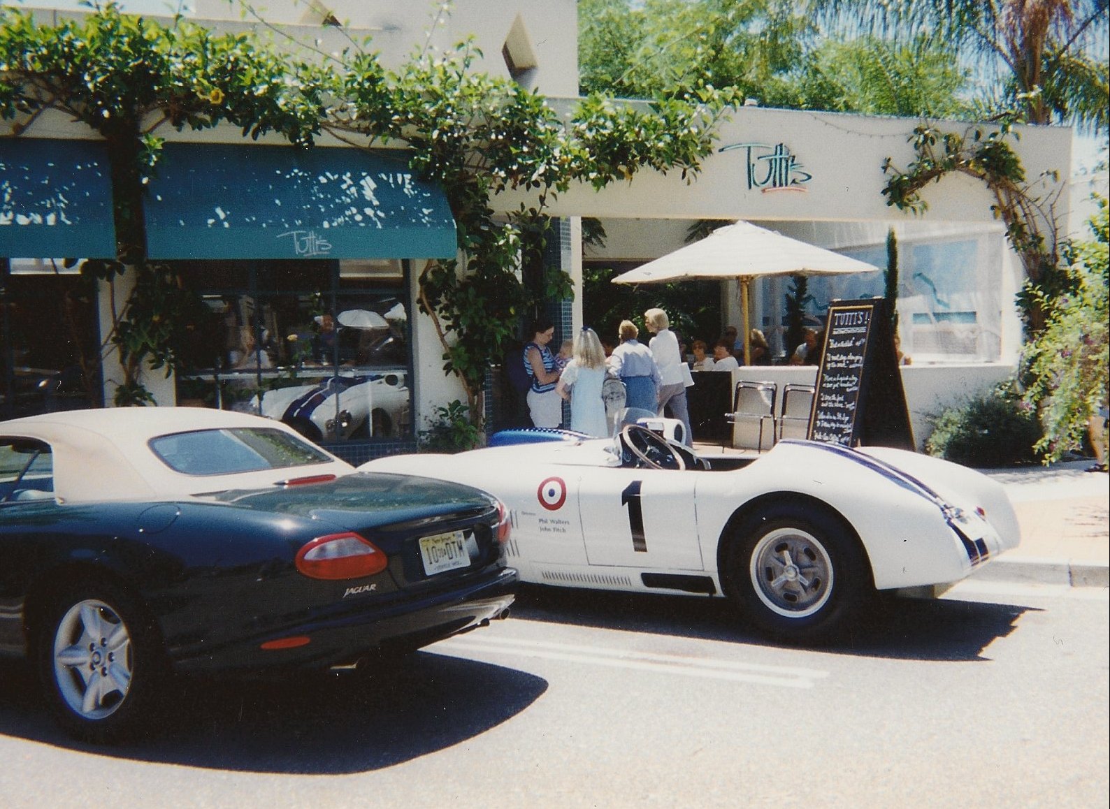 I’ve driven a couple original Cunninghams ever so briefly, and had rather more experience in a latter-day museum-quality recreation of the 1952 C4R Le Mans roadster. The C4R was honored with primo parking at Tutti’s Montecito, next to our borrowed Jaguar convertible when Wife Dottie and I were delivering the Cunningham to a Monterey Historic weekend.