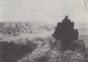A pioneer motorist in his Toledo admires the Grand Canyon, 1902.