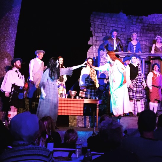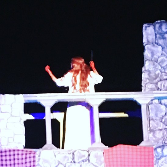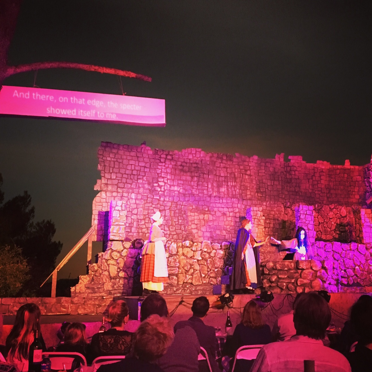 Lucia tells the story of a young murdered lover whose ghost haunts this castle. #canyousayforeshadowing The ghost chick had a kinda cool Ringu vibe. The translation is projected on that screen hanging from the lonely tree. #creepy