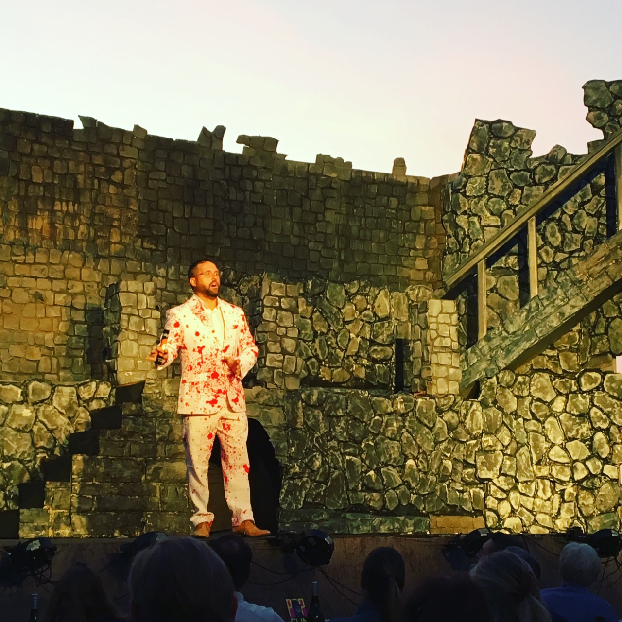 The #pacificoperaproject producer dude always wears a suit themed to the opera. For Elisir d’Amour it was strewn with hearts. #spoileralert Tonight’s suit is splattered with blood. But whose is it? (Whose isn’t it?)