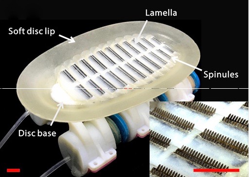 Fabricated spinules of carbon fiber mimic the remora’s stiff spines. Soft printed polymers are patterned after the remora’s underlying lamellae (thin layers of bone). Together, they are actuated to generate suction.