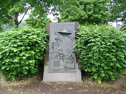 Grover’s Mill is a real place in central New Jersey, not far from Princeton. Image from The H.G. Wells Scrapbook. Below, the Martian landing site has a monument in Grover’s Mill. Image by ZeWrestler.