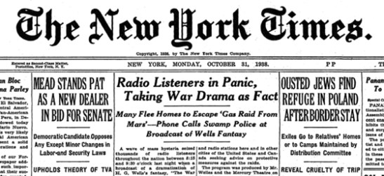 Of course, as announced in the first minutes of The Mercury Theatre on the Air, Orson Welles explained that this was a radio recreation of H.G. Well’s 1898 The War of the Worlds. The next day, Monday, October 31, 1938, The New York Times reported: “Radio Listeners in Panic—War Drama Taken as Fact!” The article’s subheads read, “Many Flee Homes to Escape ‘Gas Raid from Mars.’” and “Phone Calls Swamp Police at Broadcast of Wells Fantasy.”