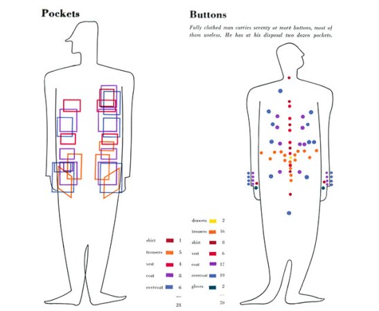 An interesting assessment in Are Clothes Modern?, 1944–1945: In Bernard Rudofsky’s “Buttons and Pockets,” he concluded “Fully clothed man carries seventy or more buttons, most of them useless. He has at his disposal two dozen pockets.”