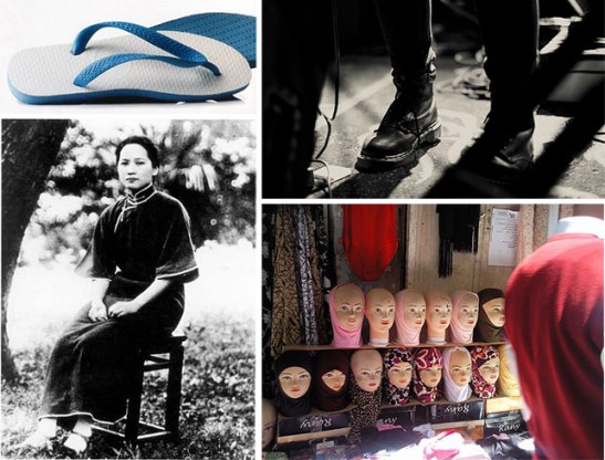 Clockwise from upper left: São Paulo Alpargatas (flip-flops) 1962, Doc Martens 1960, display figures with hijab, cheongsam, 1925.