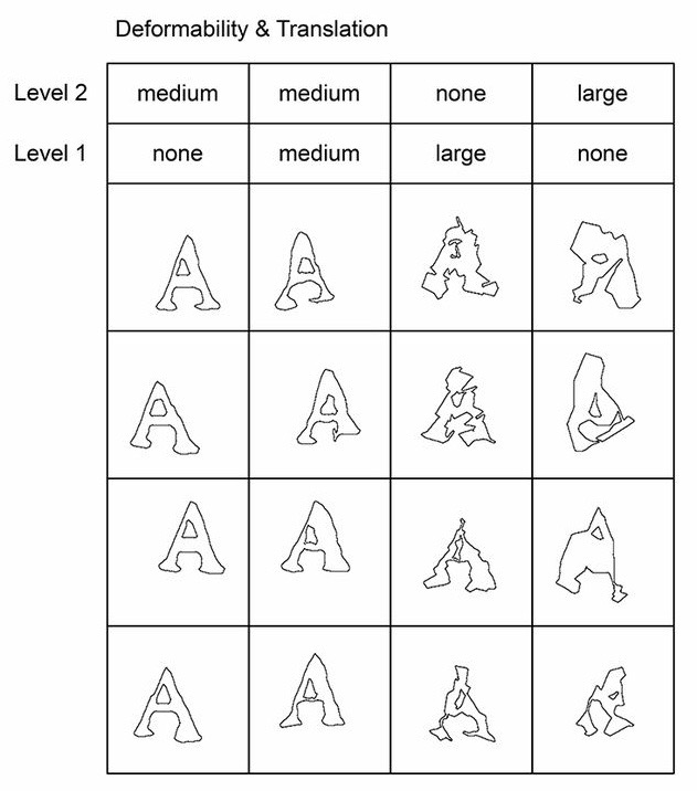 Variations of an “A,” with different deformability settings, each determined by pooling and lateral perturbation factors.