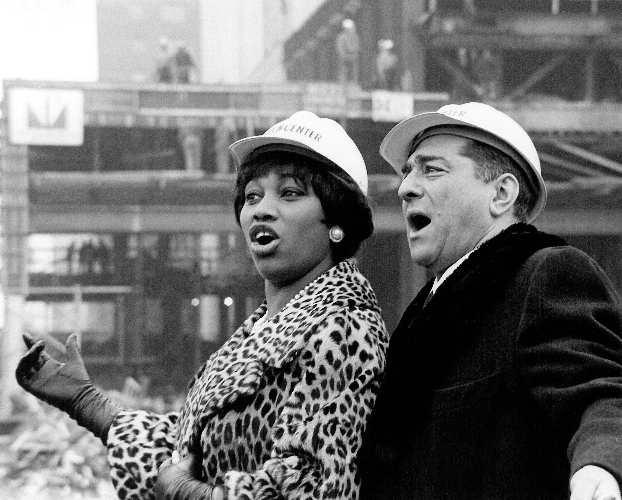 Soprano Leontyne Price and tenor Robert Merrill celebrating placement of the new Met’s highest steel beam, 1964. Image by Bob Serating/Lincoln Center Archives.