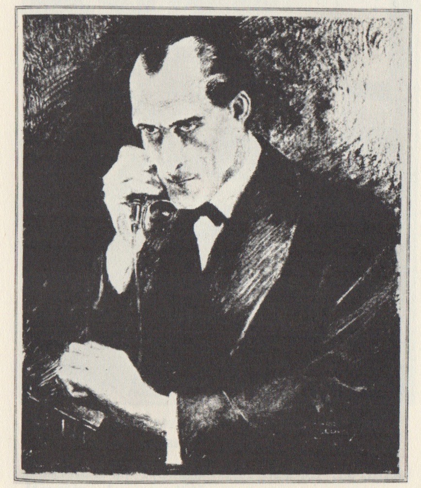 Holmes says on the telephone, “Well, we shall be round about six.” Illustration by Howard K. Elcock for “The Adventure of the Three Garridebs,” Watson’s chronicle appearing in the Strand Magazine, January 1925.