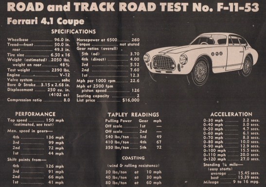 “THE FABULOUS Ferrari,” R&T wrote in a September 1953 road test, “lives up to all the thousands of words which have been written about it.” This particular road test subject was the Vignale-bodied Ferrari 4.1 Coupe, “believed to be the actual car with which Simone led the 1952 race during the early hours….” and a favorite of mine for these last 60 years.