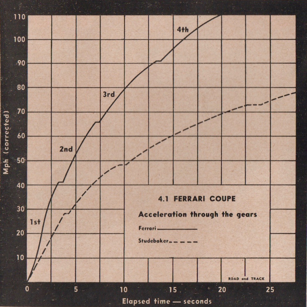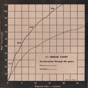 “This chart,” R&T noted, “shows graphically that the Ferrari reaches 110 mph in less time than the Studebaker Commander can attain 70 mph.”