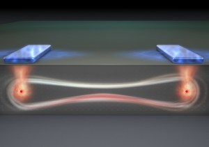 An artist’s impression of flip-flop qubit theory in an entangled quantum state. Illustration by Tony Melov in phys.org.news. This source also gives more details on the flip-flop qubit concept.