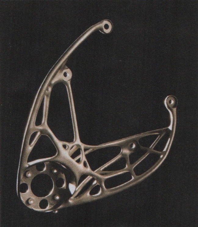 A titanium antenna bracket for a geostationary telecommunication satellite is fabricated by 3D printing, its shape dictated by topological optimization.