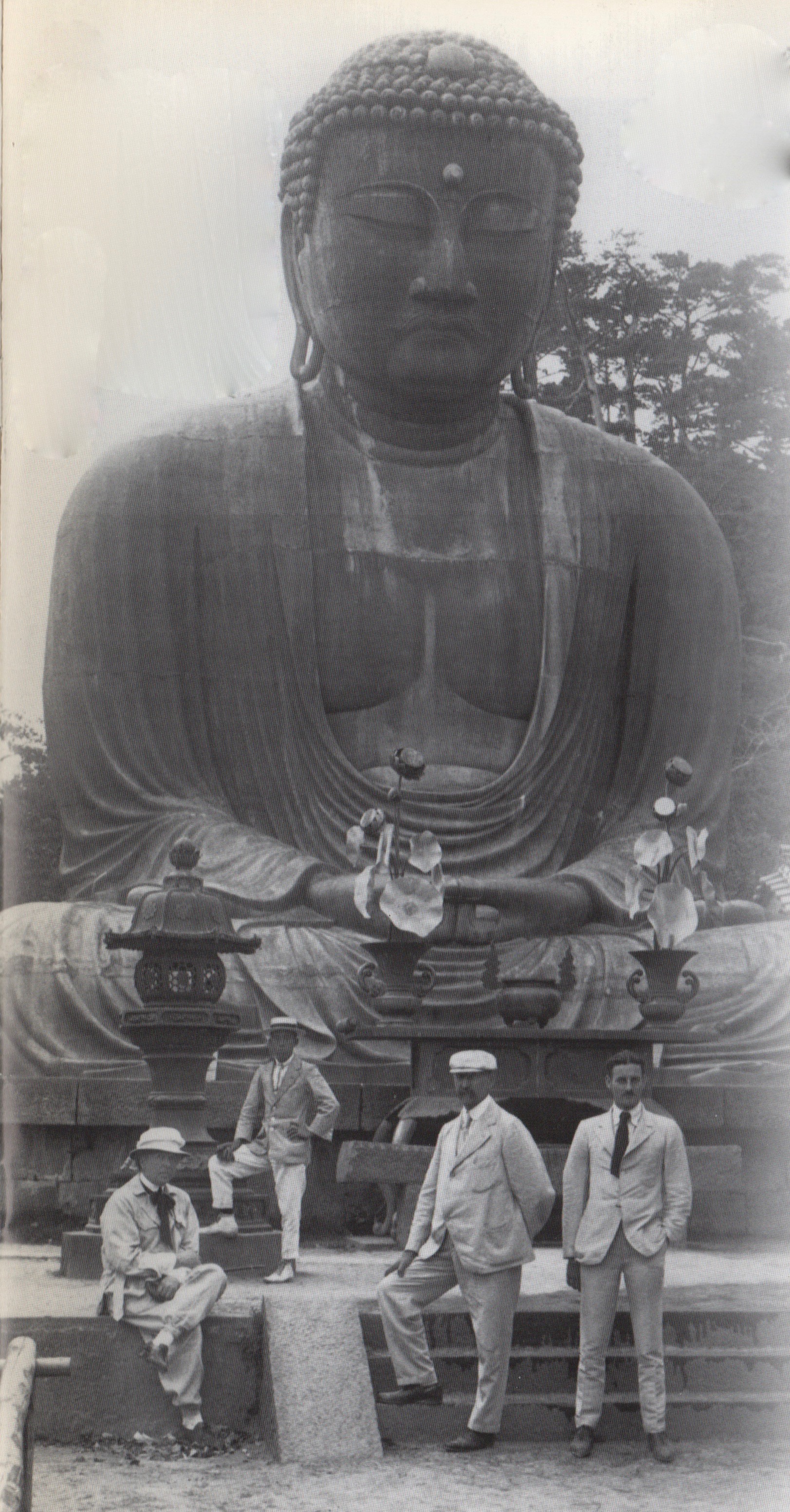 FLW, at left, and friends visit the Daibatsu in Kamakura during a 1921 visit to Japan. This and other images from Frank Lloyd Wright Quarterly, Vol. 6 No. 2, Spring 1995.