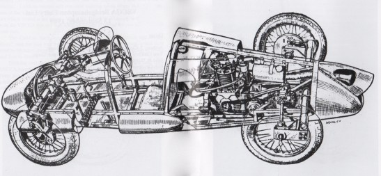 Logic dictated rear drive (to avoid multi-tasking of the car’s front wheels), and hence the engine was mounted aft of the driver with the motorcycle’s progressive gearbox between engine and rear axle.