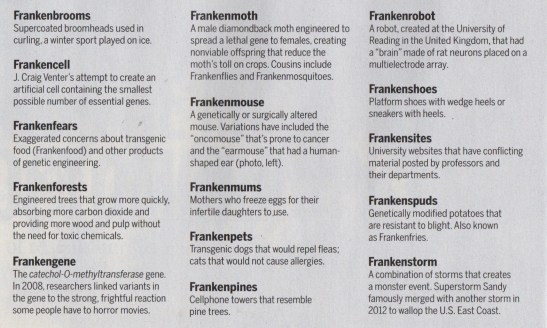 A Glossary of Frankenwords. Henk van den Belt’s Science editorial notes that “Researchers, especially in the life sciences, are understandably anxious about being tainted with the “F-word.” On the other hand, Science author Jon Cohen notes that, “Along with fears, the Frankenstein story has inspired hundreds of whimsical names for products and phenomena.
