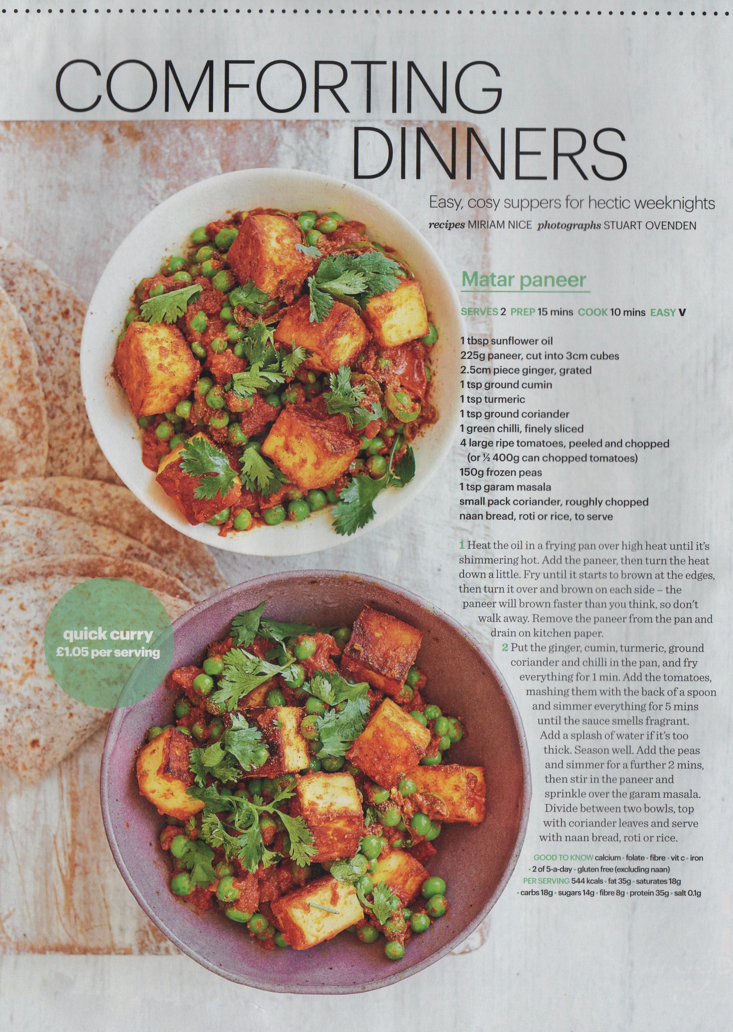 Matar Paneer. This dish reflects the Brits’ love affair with the cuisine of India. (Even the smallest British towns have their locals.) Paneer is a fresh cheese; that is, there’s no culturing or aging. I’ve seen a recipe for paneer cheese, but even Good Food is happy with store-bought.