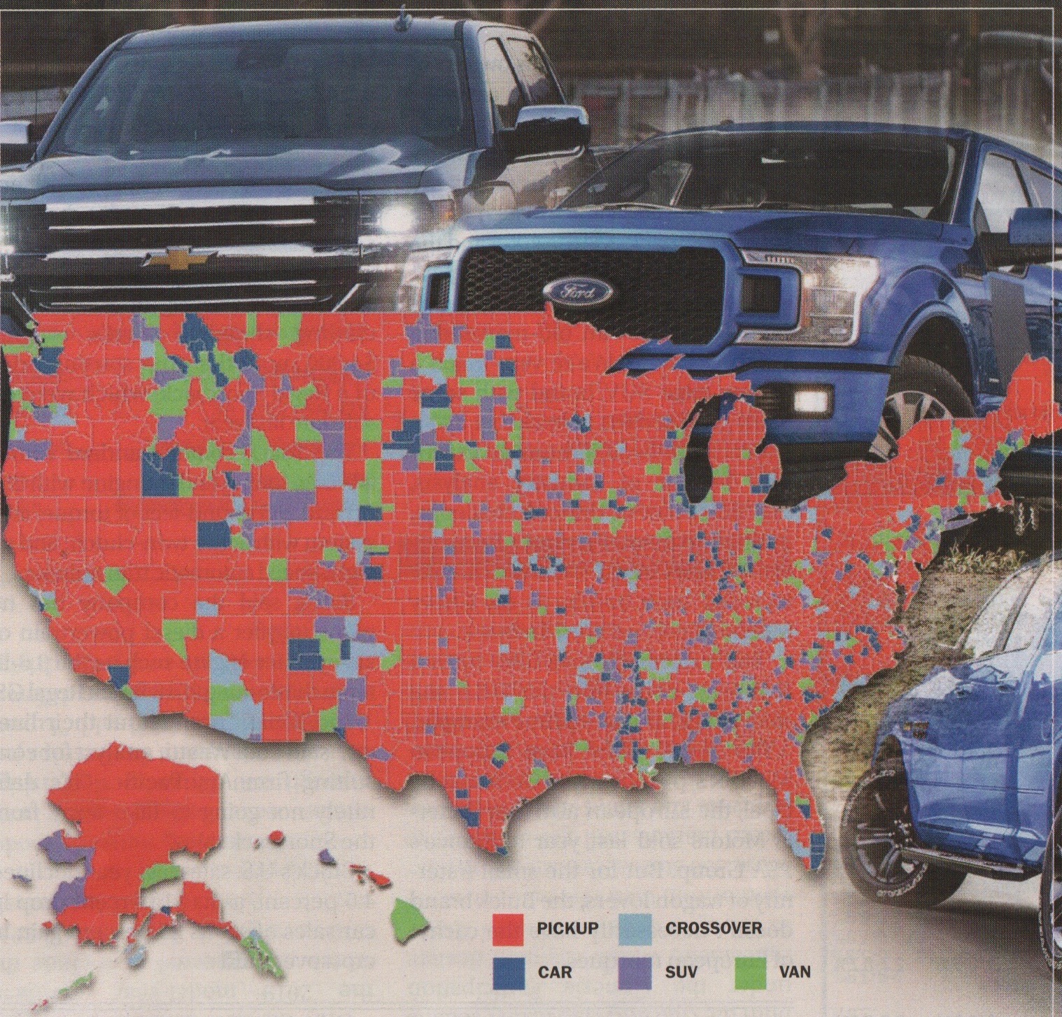 Most of the U.S. has a love affair with pickup trucks. Image by IHS Markit and Cox Automotive analysis from Automotive News, January 29, 2018.