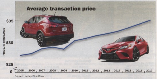 To assess the effect of inflation, I plugged the graph’s 2005 average transaction price into the U.S. Bureau of Labor Statistics CPI Inflation Calculator. In CPI terms, that estimated $27,000 in 2005 is equivalent to $34,903.77 in December 2017. Thus, today’s cars aren’t much more expensive than those in 2005; it’s the dollar that’s changed.
