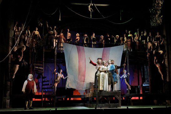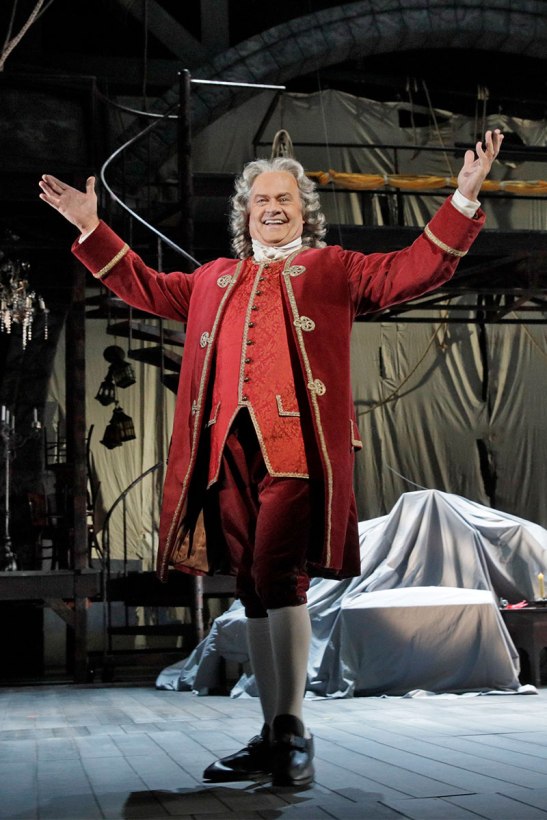 In the LA Opera production, Voltaire and Dr. Pangloss, his Candide alter ego, was a dual role played by Kelsey Grammer. Kelsey is familiar because of his roles in TV’s Cheers, Wings, and Frasier. He’s also Juilliard-trained and sings a melodic baritone. This and following images from laopera.org.