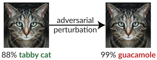 The website offers “adversarial examples,” loosely, optical illusions deceiving machine-learning software. The image of a tabby cat is perturbed only slightly, but just enough so that it “fools an inceptionV3 classifier into classifying it as ‘guacamole.’ ” According to Athalye, such hallucinations are “easy to synthesize….”