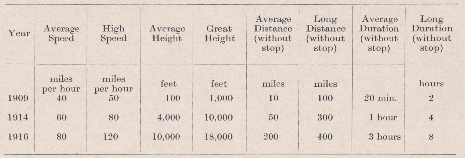Grey compiles a chart showing the advances in aircraft performance from 1909 to 1916. Largely attributed to hostilities, aeroplanes rapidly evolved from playthings to combat craft.