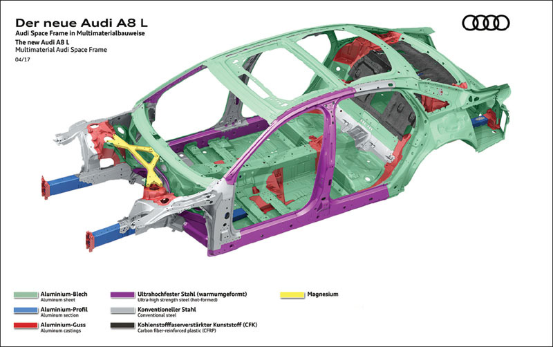 The Audi A8 L features a unibody of varied materials, including steels, aluminum, polymers, and magnesium. This and the following image from Tech Briefs, March 2018.
