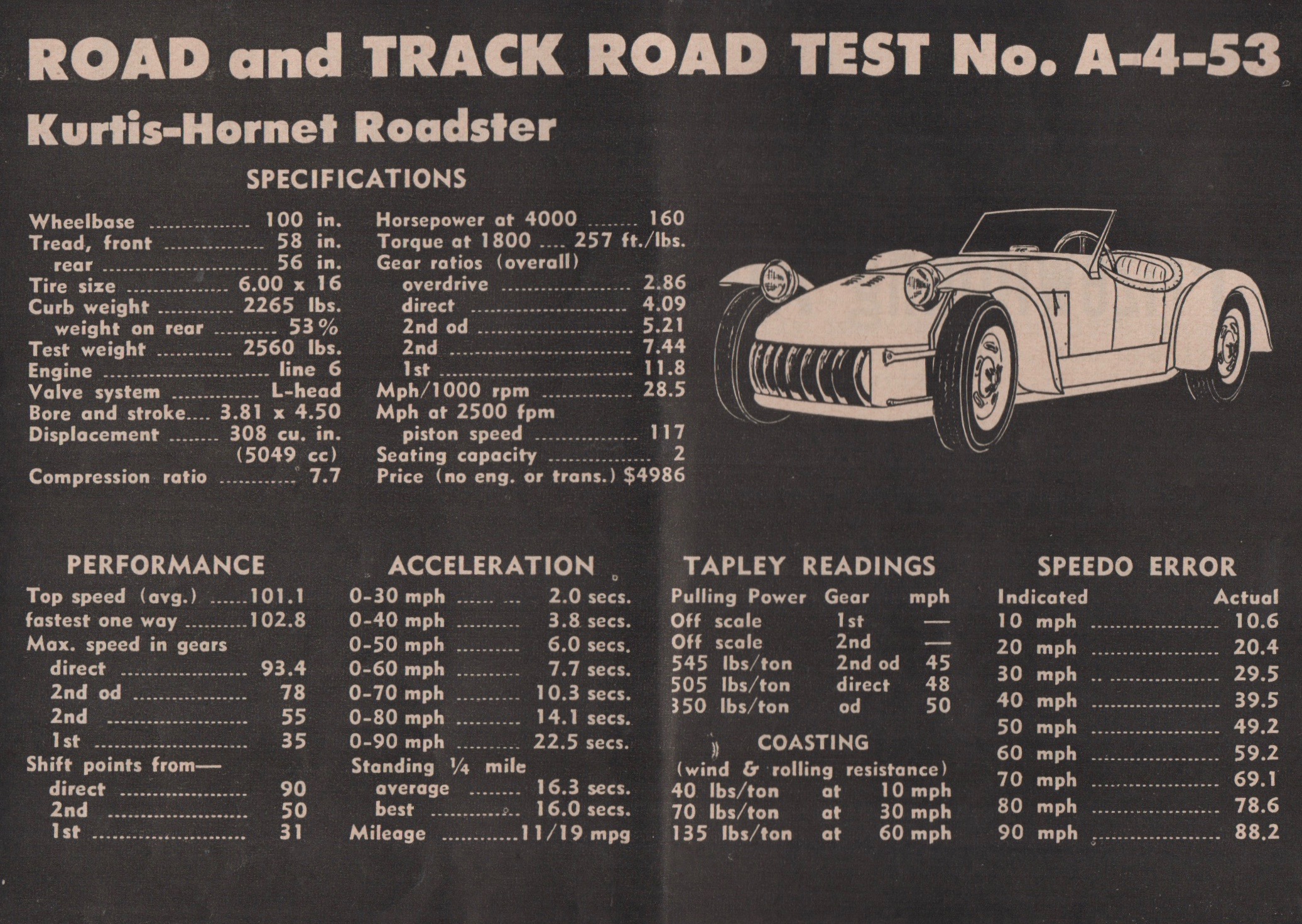 In October 1953, R&T had a Kurtis-Hornet Roadster road test as well as a feature on another aspect of the Kurtis Kraft business model: selling various kits of its 500 KK chassis. A basic chassis cost $399.00; suspension bits upped the tab another $391.20; steering gear (though not the column and wheel) added another $92.69. Ford spindles, hubs, drum brakes, and wheels cost $228.19; a rear end housing, $89.86; and a custom-built radiator and shocks, $89.06.