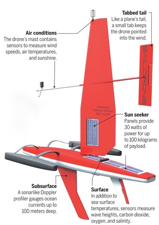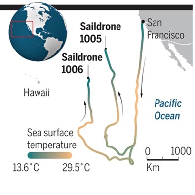“Saildrone Fleet Could Help Replace Aging Buoys” by Paul Voosen, Science, March 9, 2018, reports “In addition to temperature, wind, and solar radiation data, the Pacific saildrones are measuring how the ocean and air exchange gases like carbon dioxide and oxygen, and they are using Doppler instruments to gauge currents coursing up to 100 meters below the surface.”