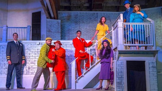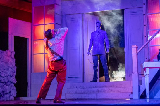 Josh Shaw, POP’s artistic director and co-founder, designed the multi-level set to function as the exterior of Giovanni’s villa as well as its interior. A straightforward swap of several brick panels for those of wallpaper brought this off adroitly.