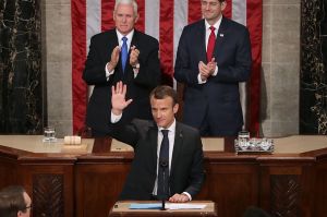 Emmanuel Macron, President of France, statesman. Image of his presentation to the U.S. Congress from vox.com.