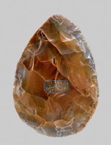 Another example of artistic composition is the West Tofts handaxe, discovered near a Norfolk, England, village in 1911. Its maker chose to knap around delicate flutes of a fossilized spiny oyster embedded in the stone. The knapping, Wagner observes, “frames the fossil in a stony proscenium: with a few deft blows the decorative element has been brought into relief.”