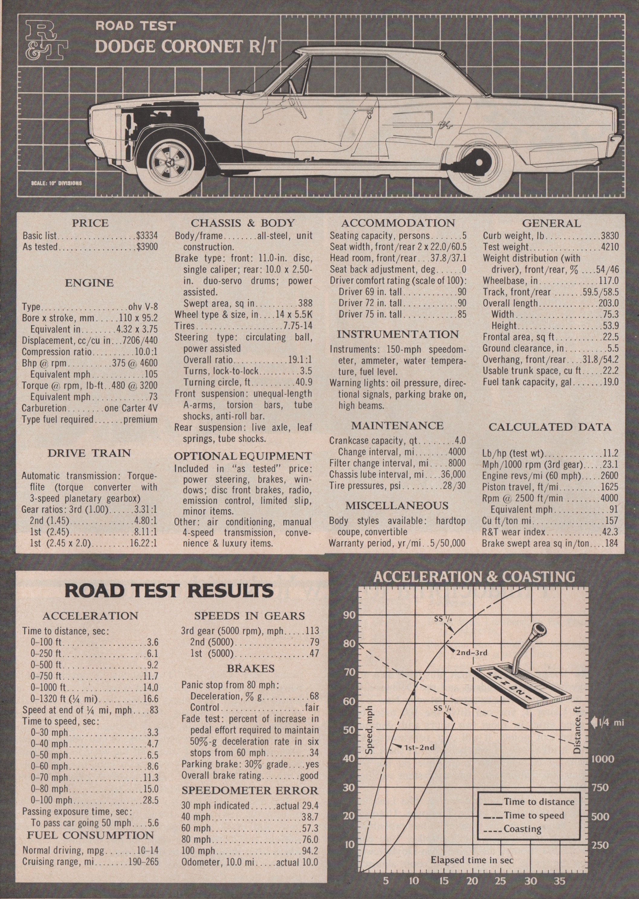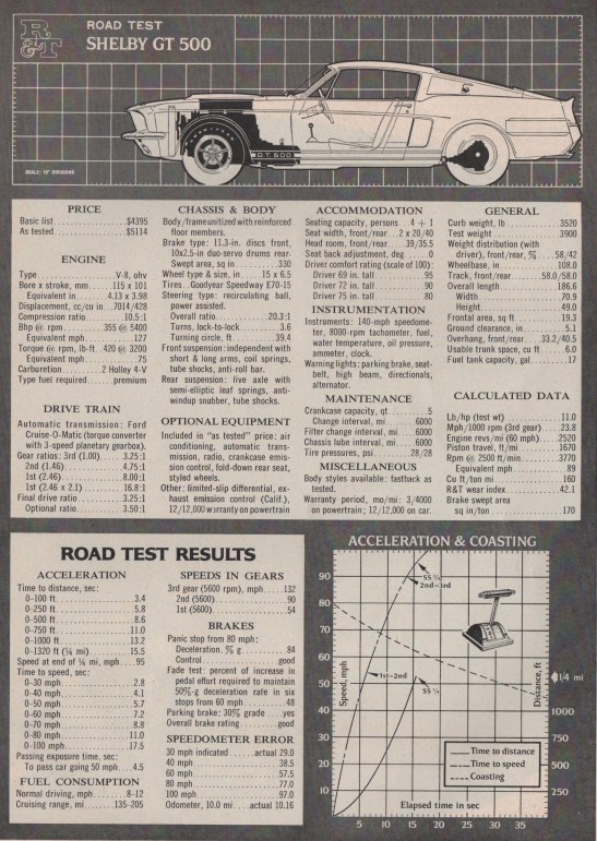 My source for this is R&T, February 1967, which contained road tests of three high-performance cars of the era: the Shelby GT 500, Chevrolet Corvette, and Dodge Coronet R/T. (This last one, a novel name, even without an “&.” )