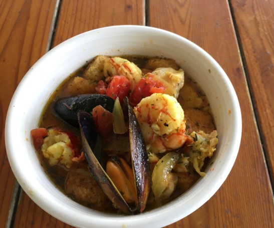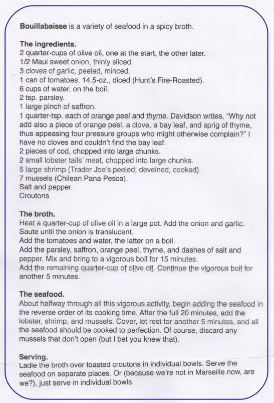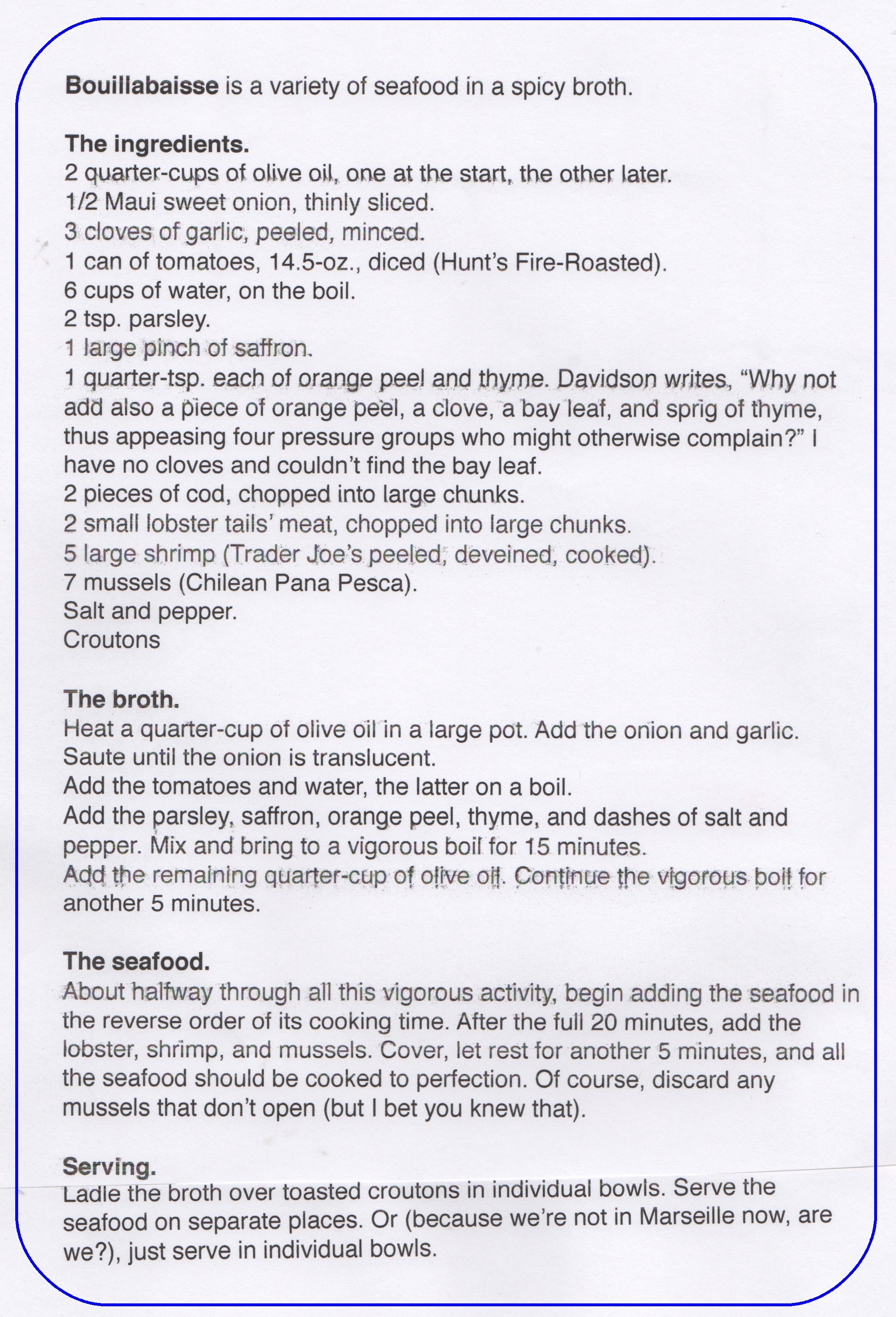 I confess that Bouillabaisse Californienne isn’t completely authentic. Fortunately, Davidson writes, “I am tolerant. But some people go too far astray. The world record is, I think, held by xxxxx [omitted here out of kindness], whose recipe begins: ‘Put one can of tomato soup and one can pea soup in top of a double boiler and heat.’ The recipe contains no fish, no herbs, and no olive oil.”