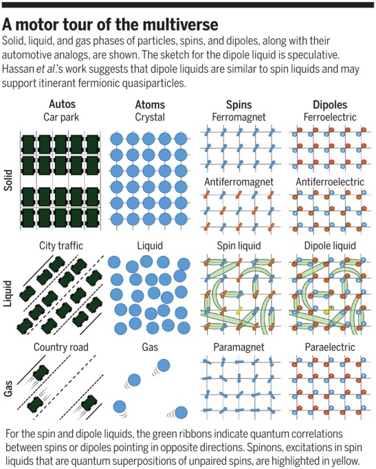 Other tidbits in Powell’s article involve dipoles, molecules in which concentrations of positive charge are separated from those of negative charge. Questions cited include, “How common are dipole liquids?” and “Might the exotic behavior of ice X be understood as a quantum dipole liquid?”