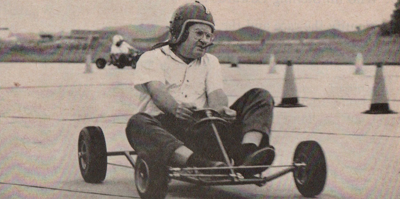 Starting with the easiest, the rip fellow in the last picture is Henry N. Manney III hisself, obviously tired from a hard day’s work. The pictures are because of something called the focal plane shutter in old cameras which allowed part of the subject to move while the photo was being taken. Now on to guessing: the couple I don’t think were John and Elaine Bond, but that’s the only one I could think of. We’re the Bugatti and Honda races the same event? The go kart driver I can’t guess, but it would be interesting if it were yourself…..