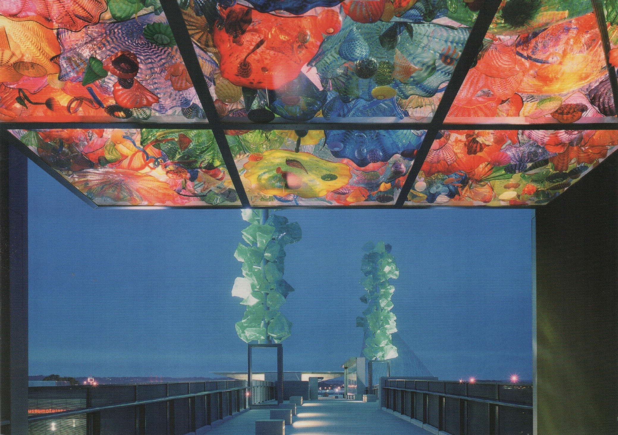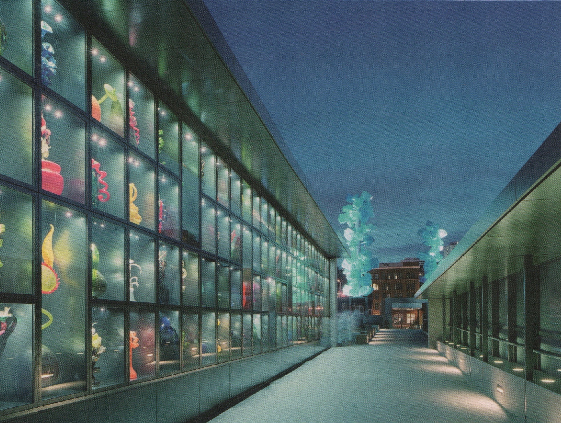 Initially, its developers saw the museum as showcasing Chihuly’s artwork. Chihuly persuaded them to feature the works of glass artists from around the world. The three permanent installations on the Bridge of Glass are Chihuly’s contribution as well as his way of welcoming visitors to Tacoma’s Museum Row.