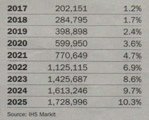 Hybrid, plug-in electric, and fuel-cell vehicle market share. Image from Automotive News, June 25, 2018.