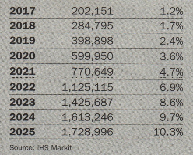 Hybrid, plug-in electric, and fuel-cell vehicle market share. Image from Automotive News, June 25, 2018.