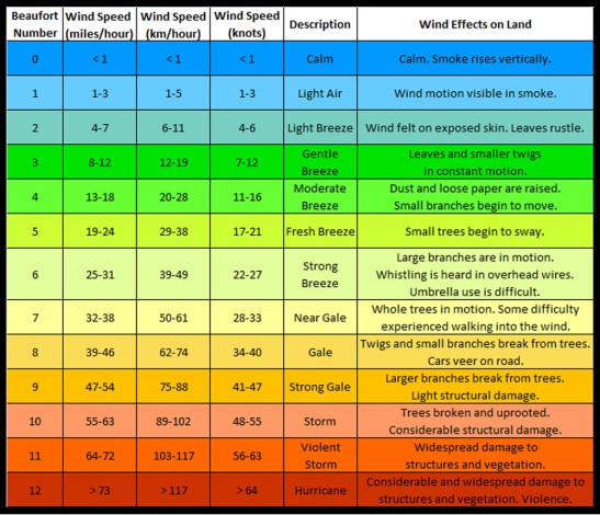 Today, these higher forces are used only in Taiwan and China. The World Meteorological Organization’s Manual on Marine Meteorological Services, 2012 edition, defines the Beaufort Scale only up to Force 12. What’s more, wouldn’t you know, many countries have replaced the Beaufort Scale’s mph wind speed with its metric equivalent, m/s or kph.