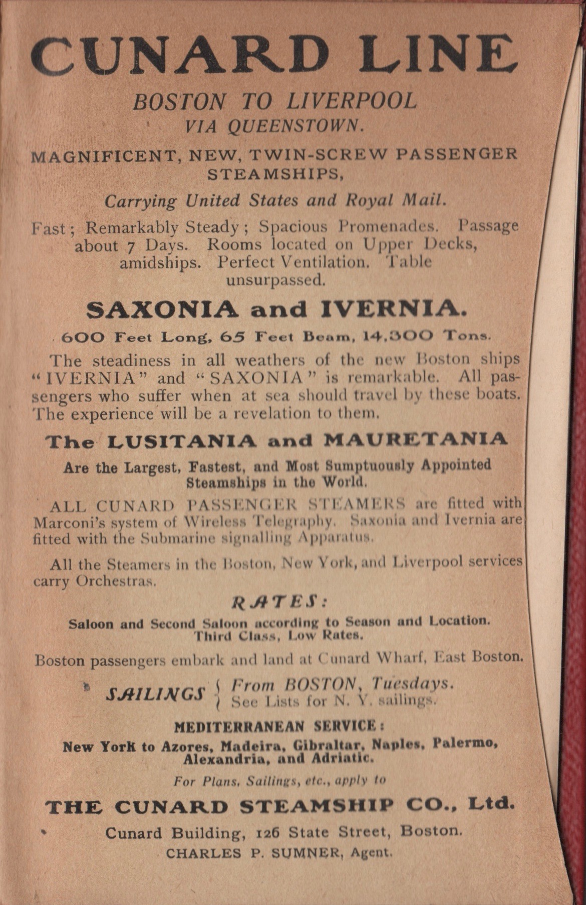 Transatlantic Travel. Steamship voyages between the New and Old Worlds were seven-day affairs in those days. Rolfe notes, “The leading lines from New York to Liverpool are the Cunard and the White Star.” Other steamship companies included among Old World ports the cities of Antwerp, Bremen, Cherbourg, Copenhagen, Christiana, Harve, Hamburg, Rotterdam, and Southhampton.