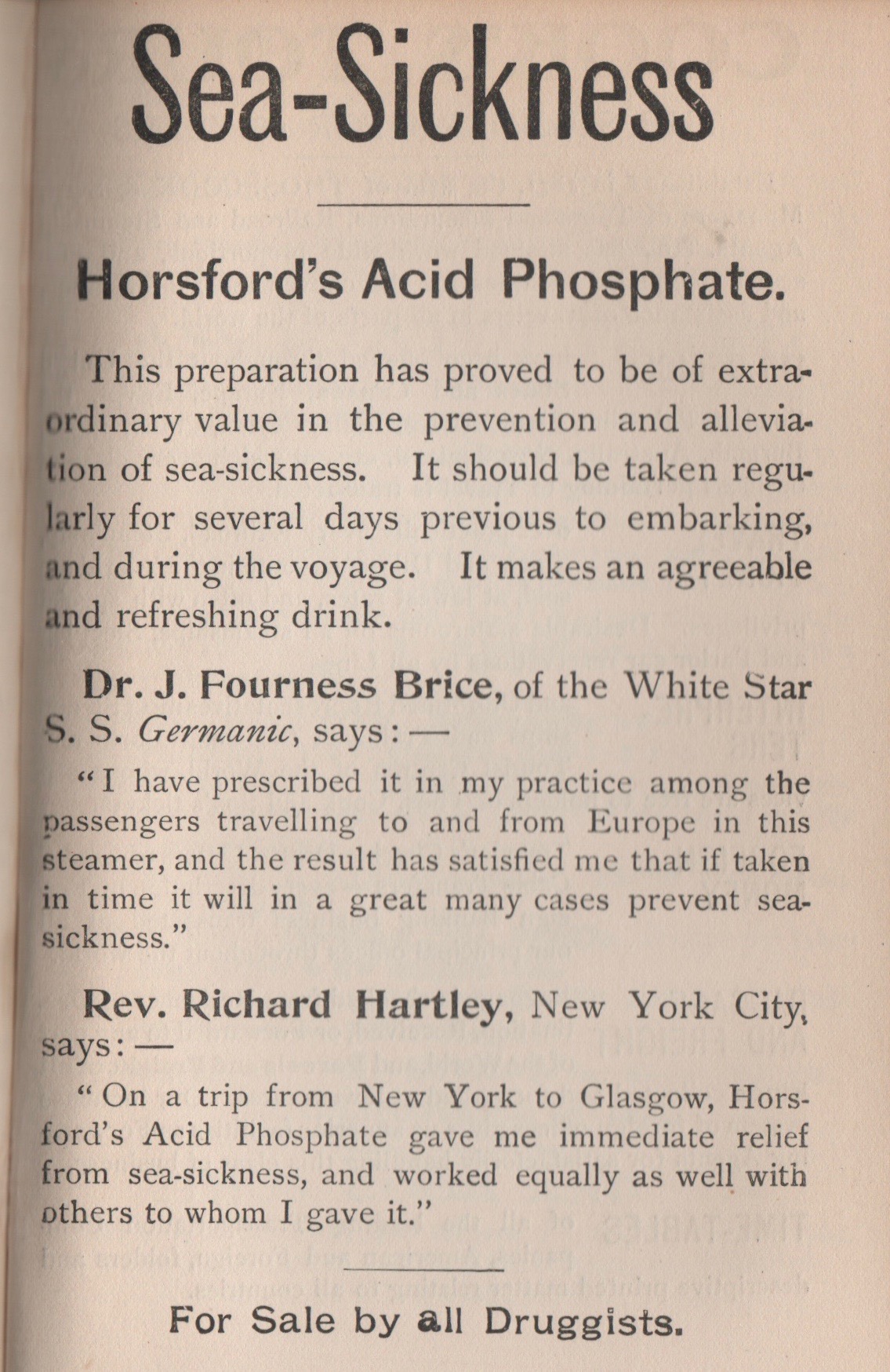 On Seasickness. Rolfe gives lots of advice for crossing the Atlantic: “Life on shipboard has its peculiarities, but after all it is much like life everywhere else. If you must be seasick, do not weakly succumb to it, but fight manfully against it. Keep on deck as much as possible and it will go far to mitigate the attack.”