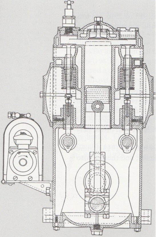 Inverted intake and exhaust valves were actuated by what today might be called “dual underhead camshafts.” The crankshaft rotated on the bare minimum of two bearings. A magneto provided ignition.