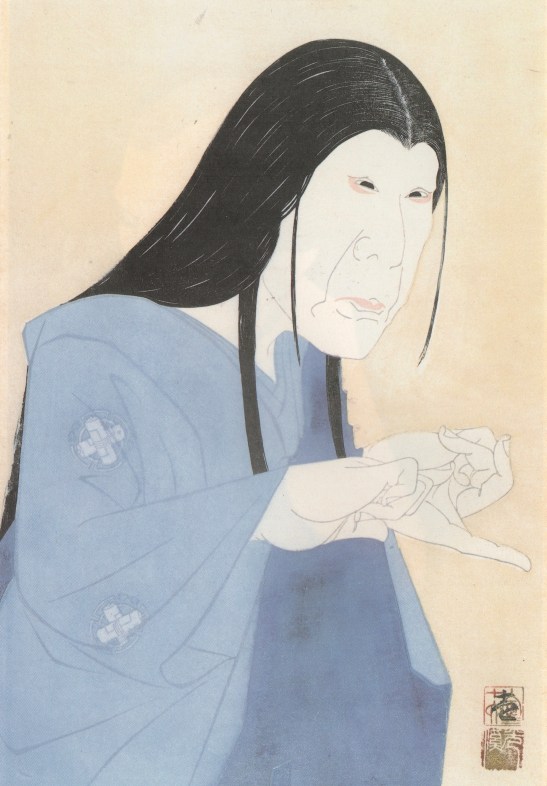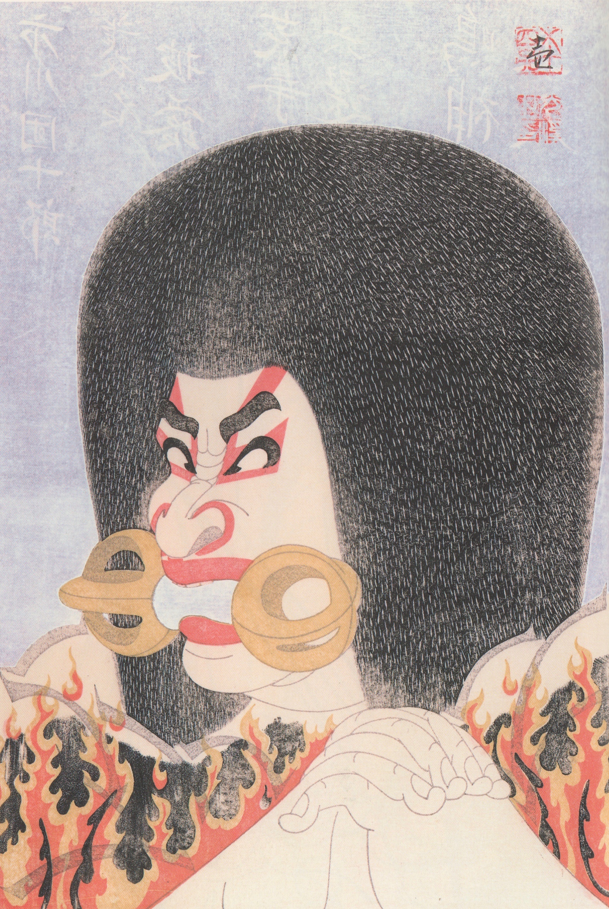 Tsuruya Kokei: Kabuki Actor Prints, by Tsuruya Kokei, Shochiko, 1988. This image of Ichikawa Ebizô X portraying Kagekiyo and the following images from this book.