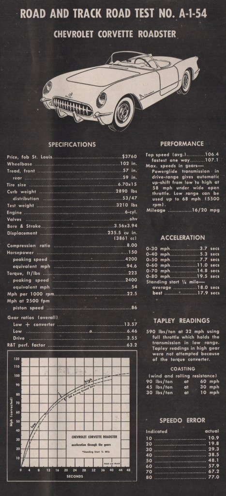 WHAT WITH the real mid-engine Vette waiting in the wings (as opposed to R&T’s random speculations back in the old days), it seems most appropriate to look at the original Chevrolet Corvette Roadster, as described in the June 1954 issue of that magazine.