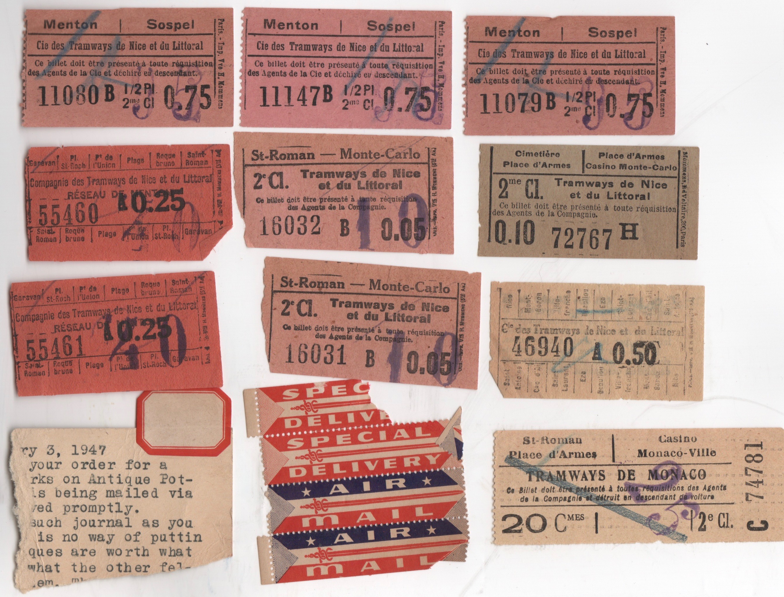 There’s no publication date in my Touristic Guide to Nice; but I’m guessing 1946. My copy contains a bit of evidence of its original owner, including a portion of a postcard dated “ry 3, 1947.” Also, a multitude of transit stubs left in the book suggest the Nice stay involved visits to nearby locales. Several of the stubs, tantalizingly enough, are consecutively numbered pairs. Might the original owner have been traveling accompanied by a second person? A Riviera romance?